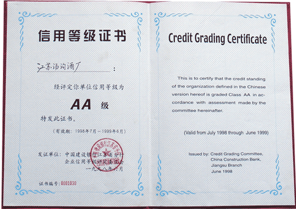 頒發(fā)單位:中國(guó)建設(shè)銀行江蘇省分行企業(yè)信用等級(jí)評(píng)定委員會(huì)